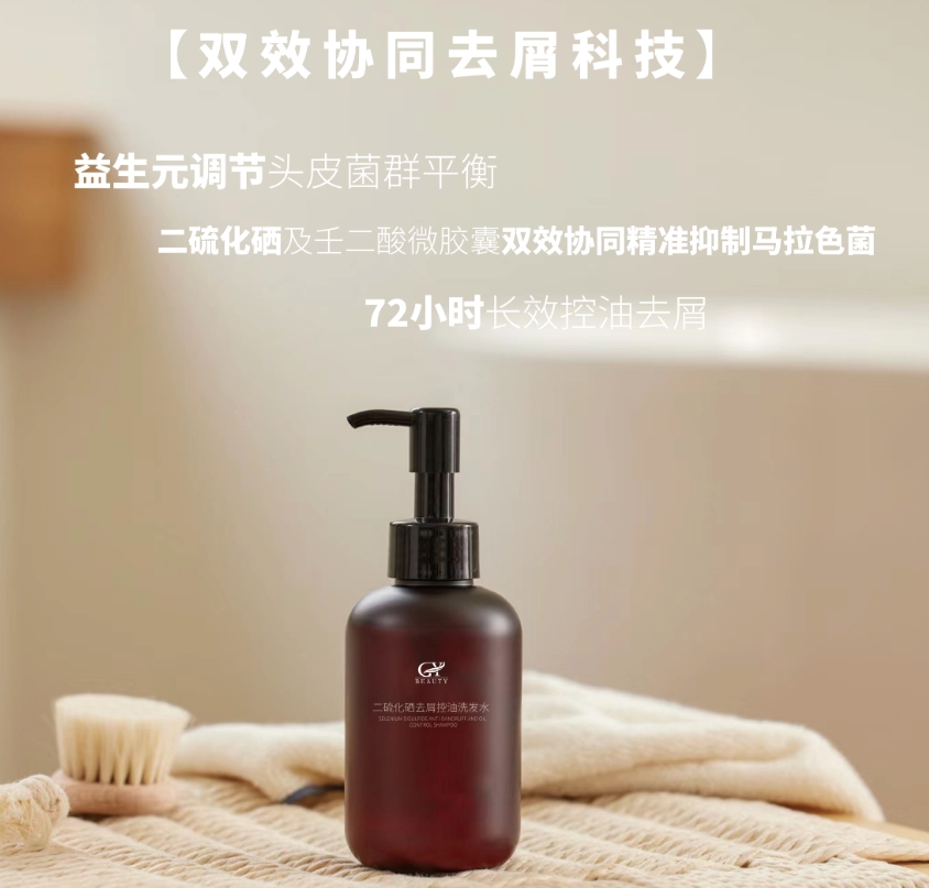 产品宣称:【双效协同去屑科技】:益生元调节头皮菌群平衡、二硫化硒及壬二酸微胶囊双效协同精准抑制马拉色菌,72小时长效控油去屑 主要概念成分:二硫化硒+壬二酸微囊+专利益生元(调节微生态)+玻尿酸(修护屏障) 差异化亮点:二硫化硒与壬二酸微囊协同抑制马拉色菌,动态调节油脂分泌;专利益生元平衡头皮菌群,配合玻尿酸修护头皮屏障,避免二硫化硒过度干燥问题。